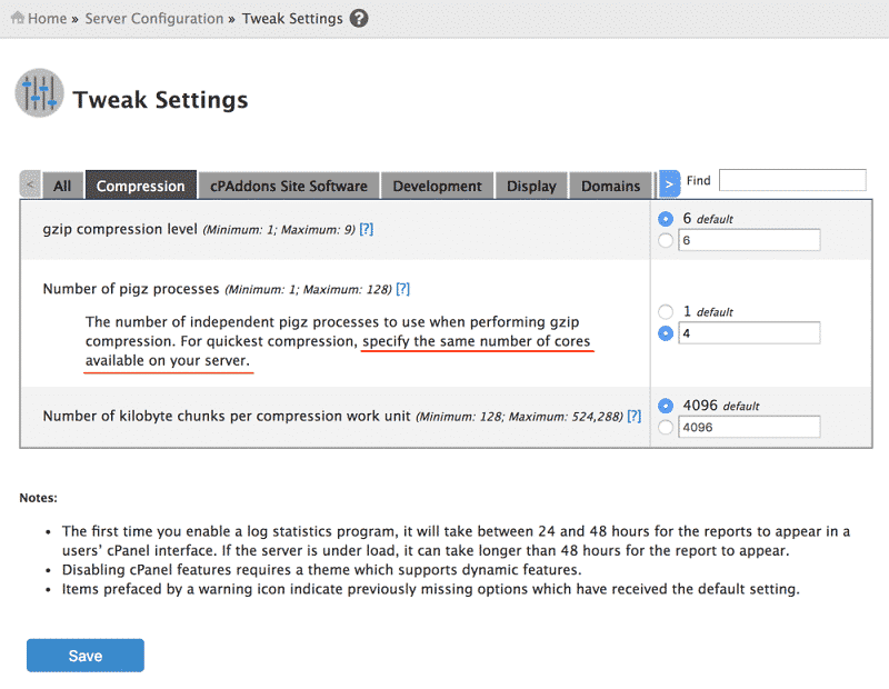 Mai târziu, în WHM, creșteți numărul de procese „pigz” în funcție de numărul de procesoare ale serverului dumneavoastră. Mulți oameni nu se gândesc la asta și nu o fac niciodată.
