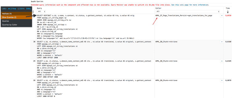 În acest moment, lucrez la un site care utilizează WooCommerce și WPML împreună. Înainte de a activa WP Rocket, am rulat un diagnostic cu Query Monitor și am detectat câteva interogări lente:
