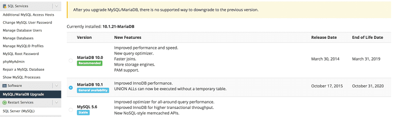 Și pentru baza de date: WHM→ Software → MySQL/MariaDB Upgrade.