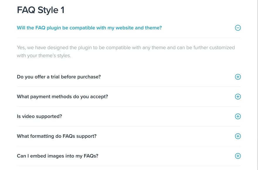 Pluginul oferă, de asemenea, stiluri de acordeon și comutare, care vă permit să afișați sau să ascundeți răspunsul la o întrebare cu un simplu clic. În plus, cu codurile scurte și widget-urile sale, puteți adăuga cu ușurință întrebări frecvente la orice pagină sau postare de pe site-ul dvs.
