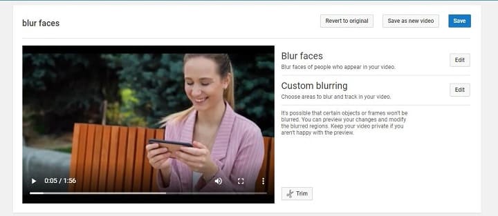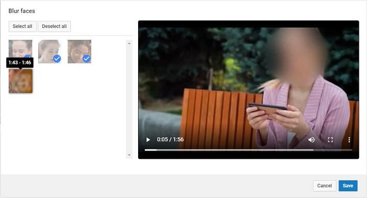 YouTube oferă o funcție foarte atentă – Instrumentul pentru Blurare YouTube, care poate ajuta eficient la blurarea fețelor prin două opțiuni – blurarea feței și blurarea personalizată. Fața încețoșată se face automat pe YouTube. Poate detecta automat aproape toate fețele oamenilor din videoclip și tot ce trebuie să faceți este pur și simplu să selectați una sau mai multe fețe pentru a adăuga efect de blurare prin câteva clicuri. Nu trebuie să vă deranjați cu keyframes și cu urmărirea mișcării în acest caz.