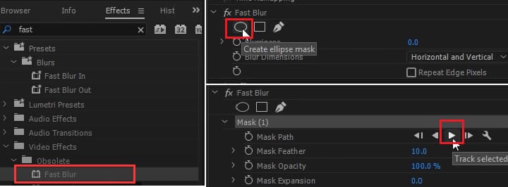 Pasul 3: În panoul de control al efectelor, sub Fast Blur, faceți clic pe pictograma Cerc pentru a crea mască Elipse și ajustați poziția acestei zone a măștii pentru a acoperi fața țintă.