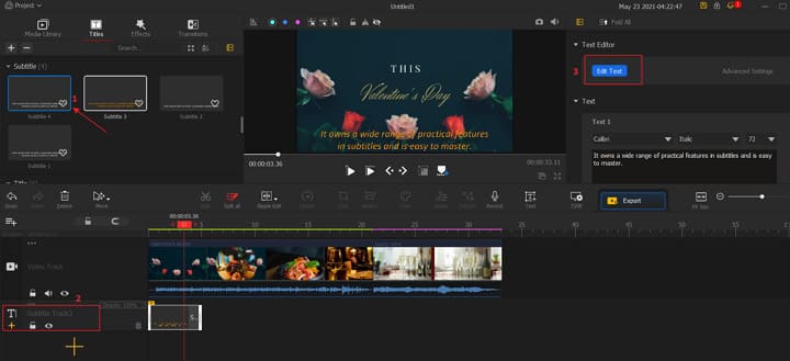Accesați Titles și alegeți un stil de subtitrare, un stil de titlu de credit sau un stil de titlu. Trageți-l pe Subtitle Track sau Overlay Track.