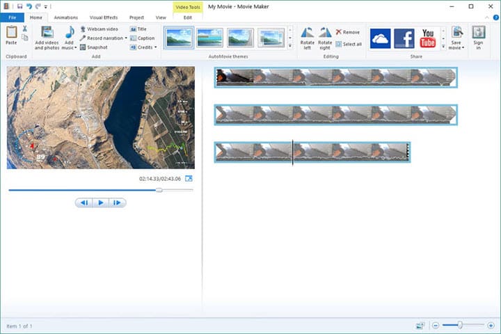 - Home – Aceasta este fila principală pentru Movie Maker. Puteți utiliza această filă pentru a insera videoclipuri, imagini, sunet, teme personalizate în clipurile dvs. video. De asemenea, puteți încărca videoclipurile pe diferite site-uri de rețele sociale, cum ar fi Facebook, YouTube și Vimeo.