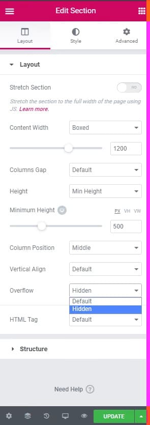 Odată ce ați determinat ce secțiune a depășit, puteți edita fila Aspect a secțiunii respective și puteți schimba Overflow în Ascuns.