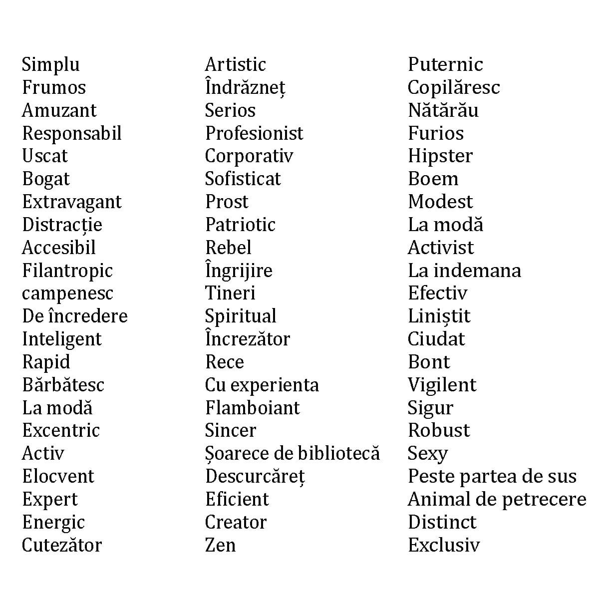 Un exercitiu de branding distractiv si util este de a pune in joc 3-5 adjective care descriu tipul de brand care ar putea rezona cu publicul. Am compilat aceasta lista de trasaturi pentru a va ajuta sa incepeti.