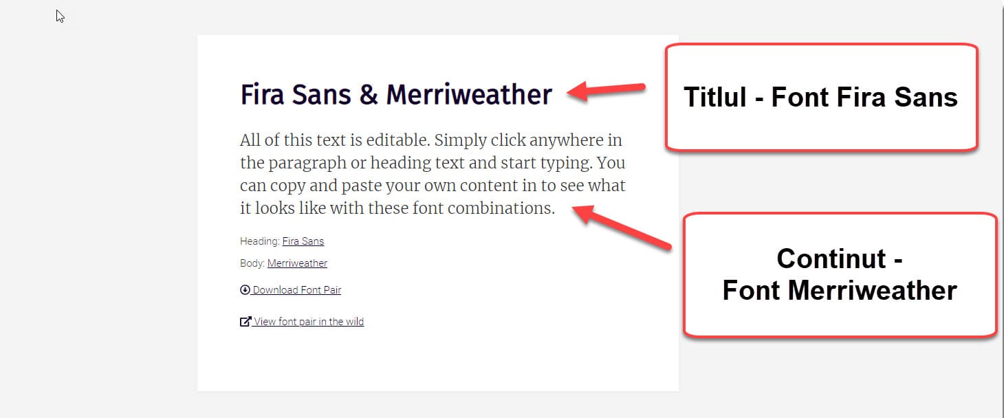 Puteti utiliza Font Pair pentru a naviga printr-o gama larga de fonturi care merg bine impreuna si le puteti descarca, daca este necesar.