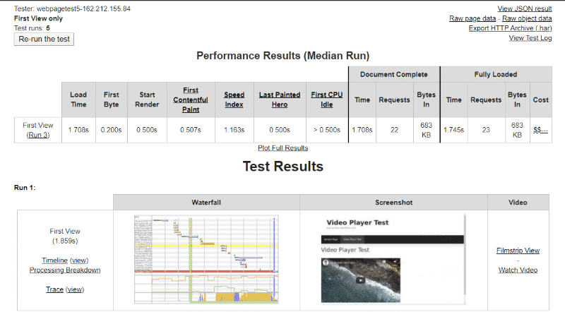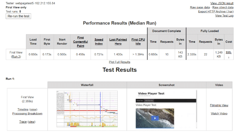 Odată ce am avut playerul video încorporat în fiecare pagină, am rulat acea pagină prin WebPageTest folosind următoarele setări: