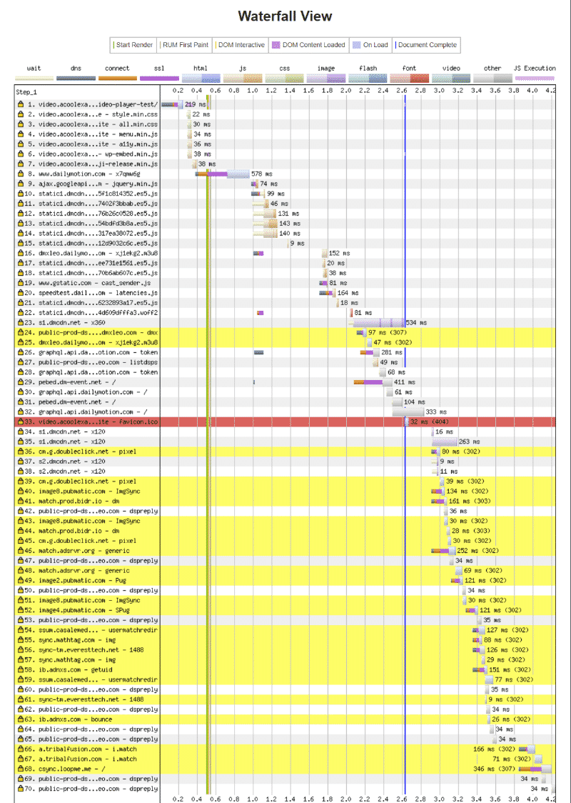 Dacă cercetați analiza waterfall pentru DailyMotion, puteți vedea că acest lucru se întâmplă deoarece DailyMotion încarcă o mulțime de scripturi de urmărire terță parte după timpul inițial de încărcare, ceea ce ajută la explicarea acelor 70 de solicitări HTTP.
