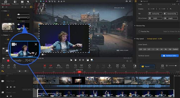 VideoProc Vlogger vă permite să creați video Picture in Picture cu ușurință și flexibilitate. Videoclipul final va fi un cadru video mai mic care rămâne deasupra videoclipului principal.