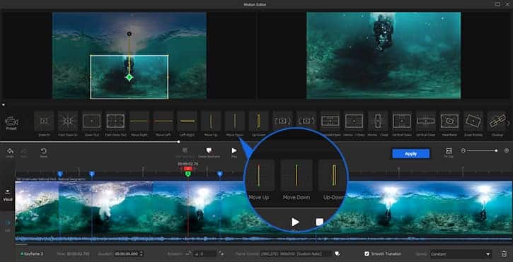La fel ca și panoramă, imitarea înclinării în post-editarea este funcțională pentru videoclipurile panoramice. Odată ce îl încărcați în VideoProc Vlogger, puteți utiliza Mutare în Sus, Mutare în Jos sau Mutare în Sus-Jos pentru a modifica unghiul de înclinare.