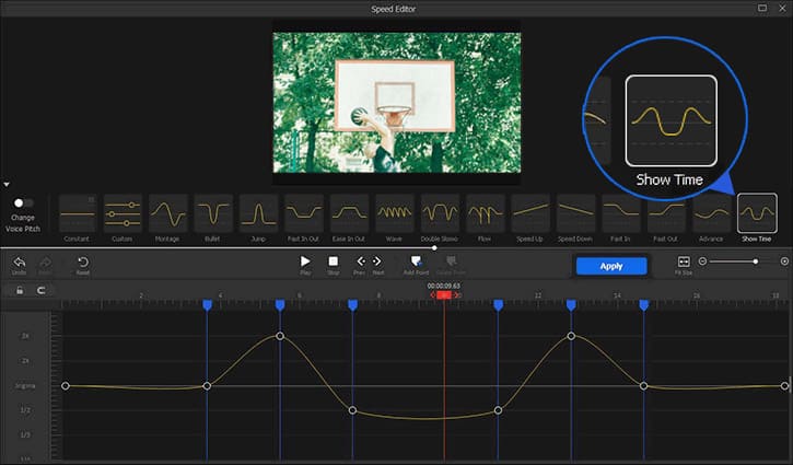 Efectul Show Time poate crește treptat viteza video până la de 3 ori față de originalul, apoi poate reduce viteza până la ½ ori față de originalul. Videoclipul va fi redat cu încetinitorul pentru un timp. După aceea, viteza video crește încet până la de 3 ori față de cea originală și apoi scade din nou la viteza inițială.