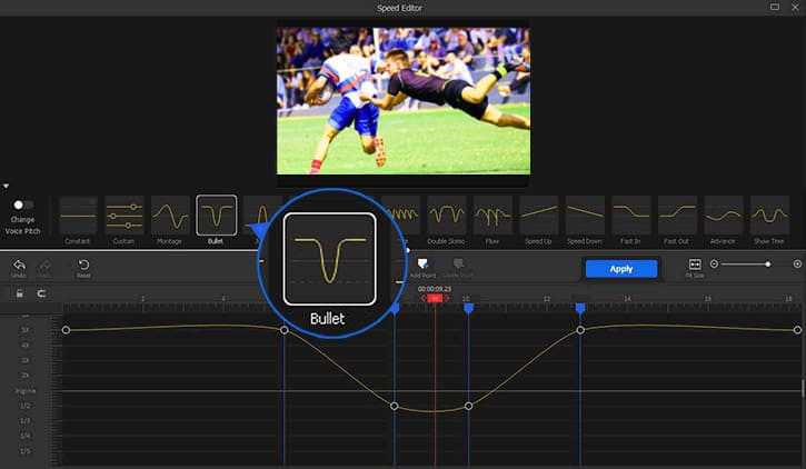 Apăsați Speed sub fereastra de pre-vizualizare pentru a obține acces la fereastra Speed Editor. Aici, puteți selecta unul dintr-o gamă de efecte de schimbare a vitezei pentru a vă ridica rapid videoclipul sportiv la nivelul următor.