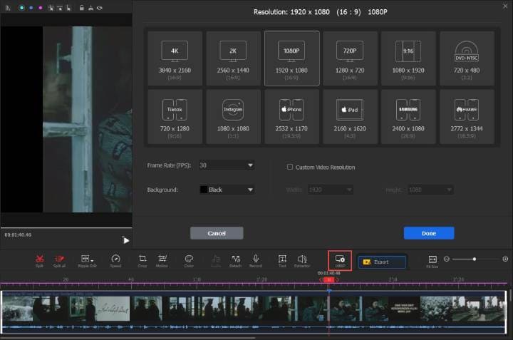 Faceți clic pe pictograma roată numită Modificați parametrii video din bara de instrumente. VideoProc Vlogger oferă mai multe presetări comune în fereastra pop-up din care puteți alege. De asemenea, puteți utiliza o rezoluție video personalizată setând lățimea și înălțimea videoclipului. Doar asigurați-vă că numărul de lățime este mai mare decât cel original.