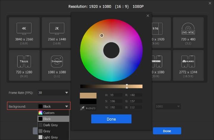 Faceți clic și extindeți fila Fundal din fereastra pop-up, puteți selecta o culoare de la Negru la Alb sau alegeți Personalizat. VideoProc Vlogger vă permite să schimbați culoarea barelor cinematografice dacă doriți. Explorați funcții de editare mai interesante cu bara de instrumente bogată în funcții din VideoProc Vlogger.