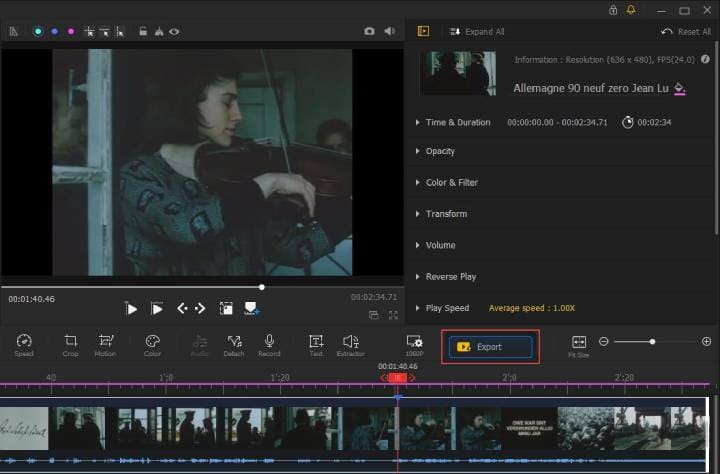 Faceți clic pe butonul Export pentru a salva clipurile video. Alegeți un format de ieșire și setați parametrii de export în fereastra pop-up.