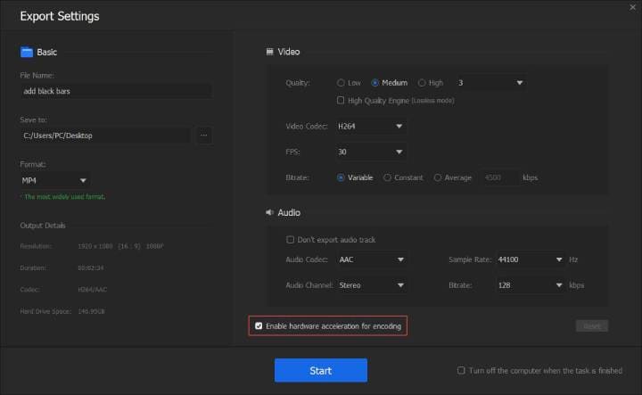 Asigurați-vă că bifați caseta Activați accelerarea hardware pentru codare pentru a obține o viteză de procesare mai rapidă.
