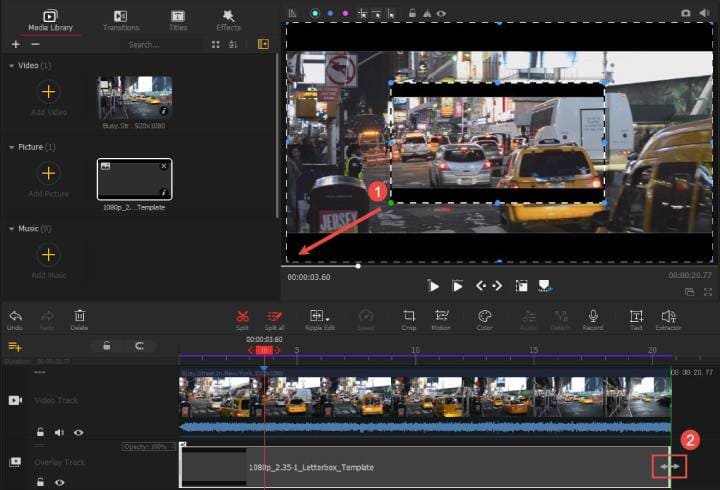 Deoarece nu există nicio diferență, cu excepția cazului în care apar barele negre, metoda de aplicare a efectului de tip pillarbox este aceeași ca și modul de adăugare a letterbox la videoclip. Puteți aplica efectul pillarbox la videoclip ajustând raportul de aspect sau folosind un PNG cu bare negre.
