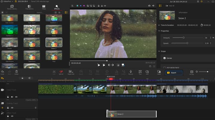 VideoProc Vlogger presetează o mulțime de efecte la modă și uimitoare, inclusiv efectele de particule animate (zăpadă, ploaie etc.), efectele grafice în mișcare (foc, inimă etc.) și efectele de corecție a culorilor (Aibo, TV vechi etc.) , pentru a vă ajuta să fiți creativ cu proiectele dvs. video. Doar alegeți unul dintre ele și adăugați acel efect la videoclipul dvs., puteți obține imediat un aspect amuzant, mister, groază, cool sau orice alt aspect creativ.