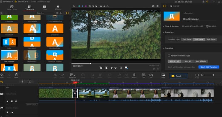 VideoProc Vlogger este unul dintre cei mai buni editori video cu efecte de tranziție. Oferă 61 de efecte de tranziție, inclusiv Wipe Left, Wipe Right, Swap, Simplu Zoom, Direcțional, Fade și Dreamy etc. Puteți face dublu clic pe opțiunea de tranziție țintă pentru a pre-vizualiza modul în care trece clipul de la o scenă la alta.