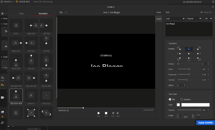 VideoProc Vlogger presetează tone de efecte de text uimitoare. Puteți alege unul dintre cele 16 efecte de stil care sunt cu diferite umbre, chenare și culori de font pentru a le adăuga la videoclip pentru a schimba rapid culoarea textului. With left Rod, Right Out, Down Roll sau o mare varietate de alte efecte de animație oferite de acest editor video decent, puteți anima un obiect text cum doriți.