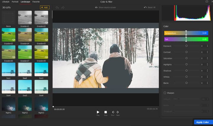 Selectați materialul țintă de pe pista cronologică, alegeți Color Editor din Panoul Inspector din dreapta. Aici, puteți alege unul dintre cele peste 60 de filtre 3D LUT și apoi alegeți Aplicare culoare pentru a schimba culoarea videoclipului.