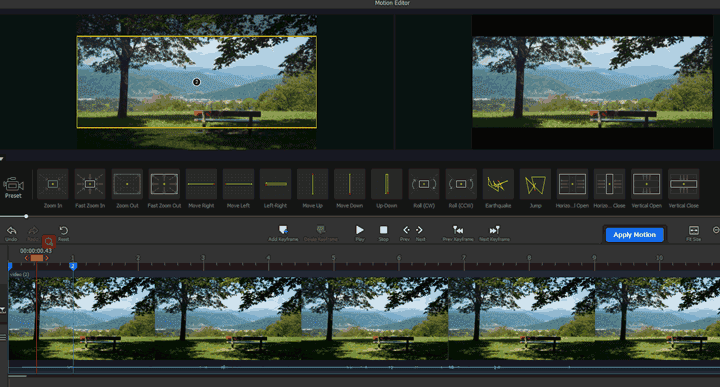 În VideoProc Vlogger, puteți utiliza presetări precum Mutare în sus și Mutare la dreapta pentru a imita mișcarea camerei, selectați Închidere verticală sau Închidere orizontală pentru a adăuga efectul de tranziție de decupare apropiată… Există zeci de presetări de efecte de mișcare, permițându-vă să vă animați videoclipurile sau să creați, ele par mai naturale într-un singur clic fără cunoștințe speciale.