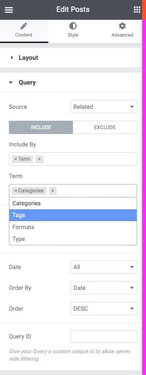 Cum să Adăugați Postări Înrudite în Elementor? Folosind Widgetul Postări în Single Post Template, puteți afișa postări înrudite după termeni. Termenii includ categorii, etichete, tipuri și formate.