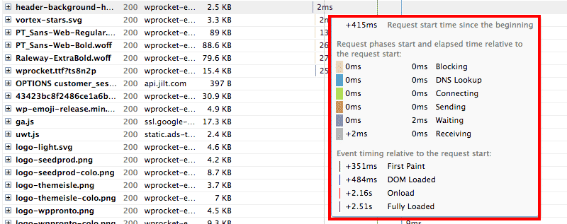 Trecând pe bara de timp de încărcare pentru fiecare resursă se va deschide o fereastră pop-up în care diferitele faze ale procesului de încărcare a resursei sunt exprimate în culori diferite: