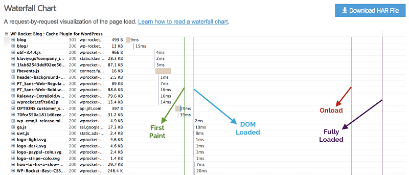 Diagrama cascadei descrie comportamentul de încărcare a paginii dvs., disecând fiecare cerere și măsurând calendarul acesteia.