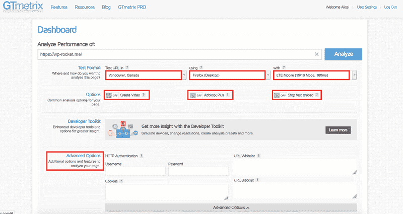 Mai multe opțiuni de personalizare (regiunea serverului de testare, tipul de browser etc.) fac experiența cu GTmetrix completă și fiabilă.