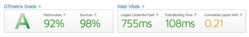 De aceea, veți vedea scorurile de performanță externe în stânga (GTmetrix nu calculează unul dintre ele) și detaliile Core Web Vitals în dreapta: