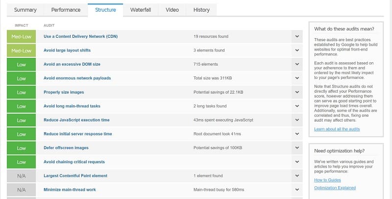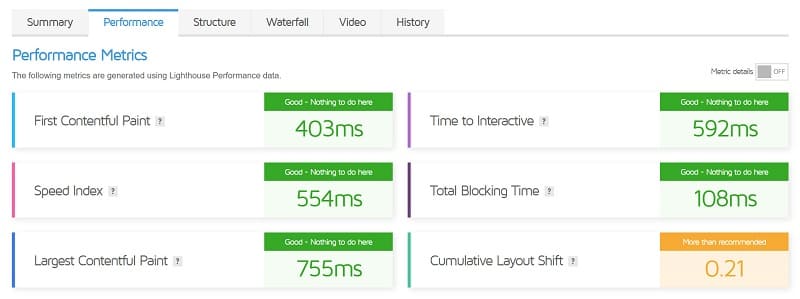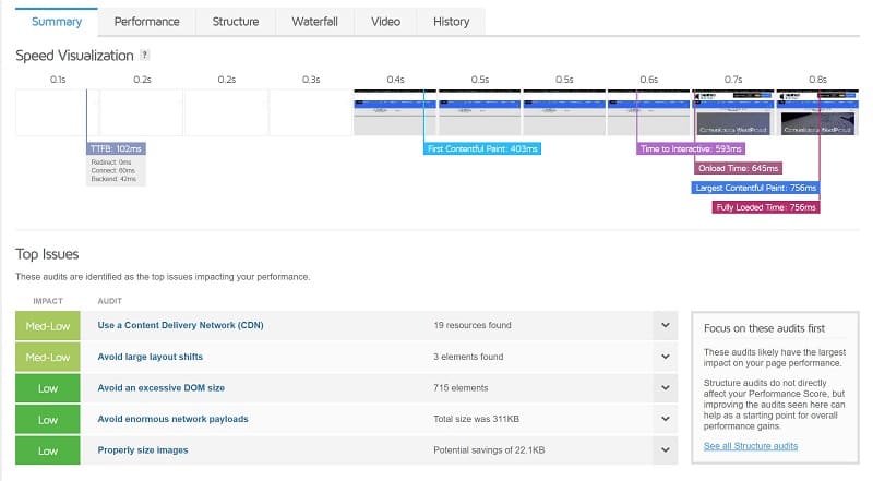 Lucrul bun despre GTmetrix este că oferă nu numai indicatori de viteză și performanță (cum ar fi timpul de încărcare în secunde și scoruri), ci și un set cuprinzător de file de explorat: de la diagramele Waterfall la calendarul evenimentelor, până la fila temporizări, plus o grămadă de informații și explicații detaliate despre indicatorii de performanță.