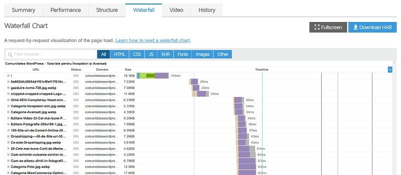 În timp ce PageSpeed se concentrează în principal pe culori și scor pentru a ghida utilizatorii prin recomandările sale, GTmetrix se bazează pe o interfață mai clasică, unde waterfall joacă rolul principal.