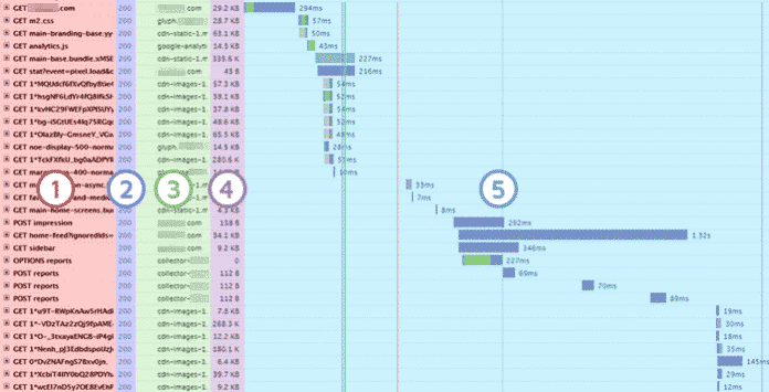 Pentru fiecare solicitare aveți timpul de încărcare, reprezentat de bare orizontale: cu cât bara este mai lungă, cu atât cererea va fi mai lentă pentru descărcare/executare.