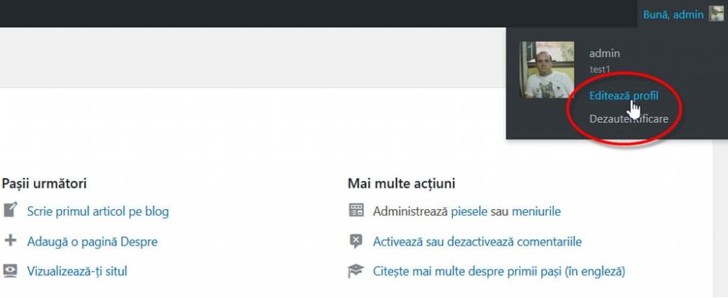 - In bara de instrumente, in coltul din dreapta sus , unde te saluta wordpress, pune mouse-ul pe numele tau , bara se va expanda și dati click pe editeaza profil….