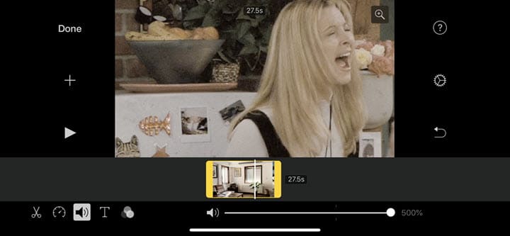 Puteți folosi iMovie, aplicația gratuită de amplificare a volumului video pe iPhone. După ce ați încărcat un videoclip din biblioteca Photos în proiectul de film, trebuie doar să atingeți pictograma de volum sub fereastra de pre-vizualizare și să trageți glisorul spre dreapta pentru a îmbunătăți sunetul video.