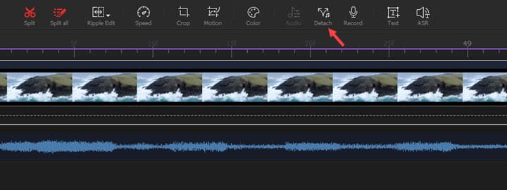 Trageți fișierul video din Media Library în Video Track în cronologie. Faceți clic pe opțiunea Detach din bara de instrumente pentru a separa sunetul de acesta. Acum puteți vedea o formă de undă în Audio Track.