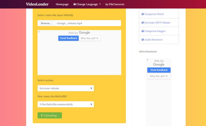 Amplificatoarele de volum video online, cum ar fi VideoLouder, oferă o soluție ușoară atât pentru utilizatorii de computer, cât și pentru utilizatorii de telefonie mobilă, pentru a schimba sunetul video. Dacă nu aveți nevoie de alte editări, puteți încerca această metodă.
