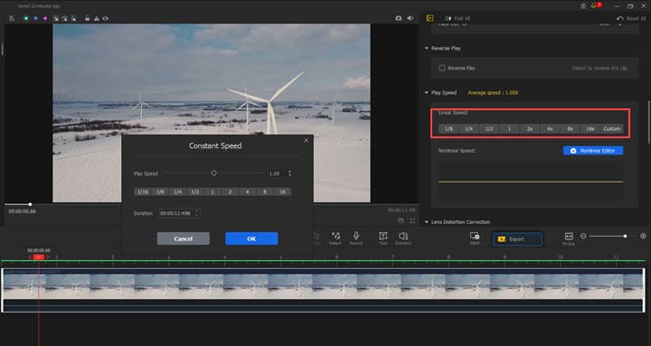 Faceți clic pe Speed în bara de instrumente pentru a deschide editorul de viteză neliniar. Puteți accelera videoclipul de 8 ori în modul Constant sau de până la 32 ori în modul Personalizat.