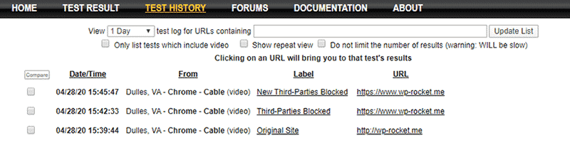 • Comparați cele două rezultate utilizând funcția „Comparare” WebPageTest din panoul său „Istoric test”.