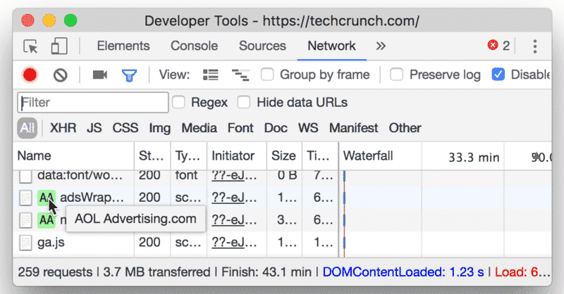 Chrome DevTools acceptă evidențierea solicitărilor de rețea de la terți în panoul „Rețea”. Această funcție vă permite să obțineți informații detaliate despre solicitările de script de la terți pe o pagină.