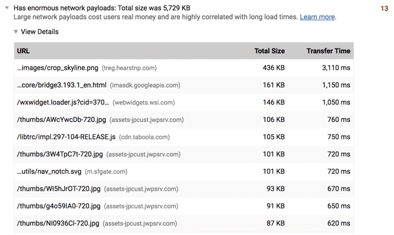 Instrumentul Lighthouse încorporat în Chrome vă arată și resursele costisitoare de la terți pe o pagină ordonată în funcție de dimensiunea și timpul de transfer.