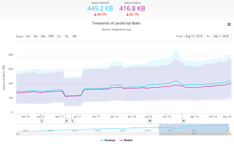 Scripturile de la terți sunt peste tot. Conform raportului State of JavaScript de HTTPArchive, numărul mediu de scripturi externe solicitate de site-uri web este de 20, iar dimensiunea totală a acestora este de aproximativ 449 KB.