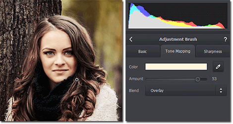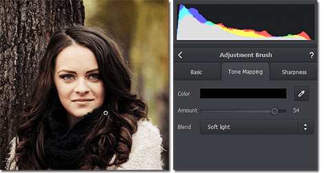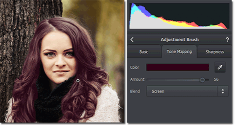 Lansați PhotoWorks și adăugați fotografia pentru colorarea digitală a părului. În fila Retușare ( Retouch ), există un set de instrumente de editare extins pentru a lucra la imagini portret. Pentru a schimba culoarea părului, selectați instrumentul Adjustment Brush. Reglați setările pentru dimensiunea pensulei, pene și opacitate: alegeți cât de mare, moale și clară va fi. Cu pensula, începeți să pictați peste păr pentru a crea un strat de mască special.