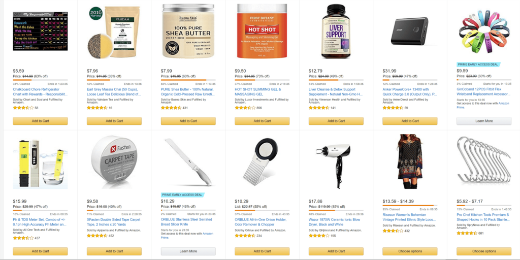 Dupa cum puteti vedea in exemplul de mai jos, Deals Lightning se desfasoara in mai multe categorii diferite, cum ar fi sanatatea si ingrijirea personala, casa si bucatarie, electronice de consum, moda, bacanie si multe altele. Din nou, aceasta este o modalitate excelenta de a vinde produsele, nu numai pe termen scurt, dar si de a castiga noi clienti pentru achizitiile viitoare.