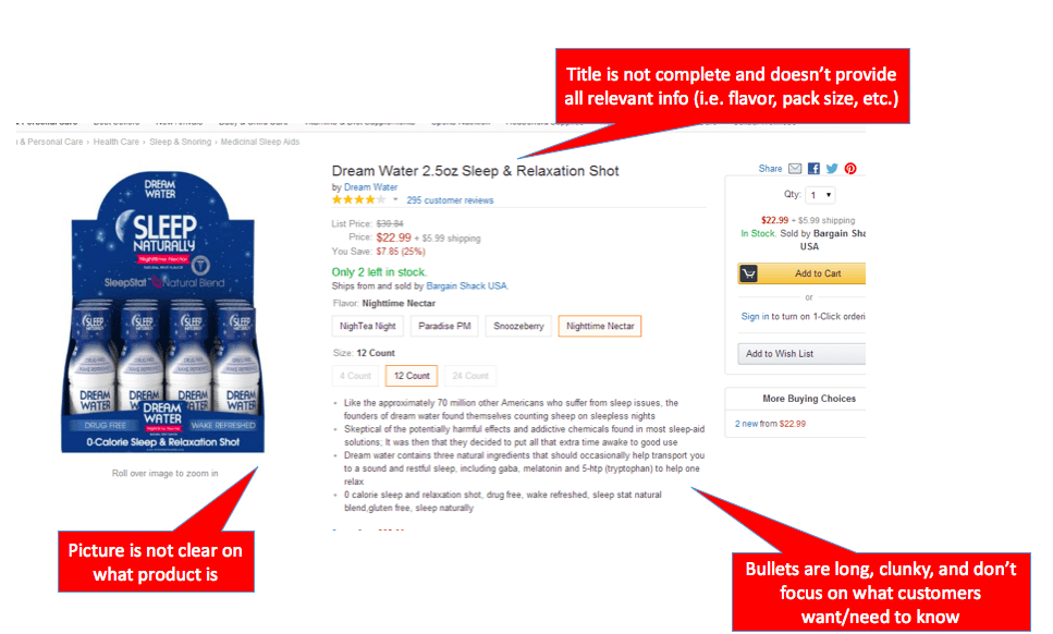 Sa crezut ca adaugarea cat mai multor cuvinte cheie intr-un titlu ar ajuta la SEO. Dar daca te uiti la cele mai bune vanzari in categoriile populare, titlurile lor nu sunt de obicei mai mult de 10-20 de cuvinte. Acest lucru este probabil datorita faptului, clientii nu au un timp sa scaneze rapid titluri lungi si pot chiar sa se enerveze cu titlurile afisate in acest fel. ( Ca sa nu mai vorbim ca titlurile pot fi taiate in timp ce ei cauta pe mobil sau pe oferte).