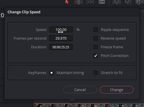 Pentru a modifica viteza pentru un clip în Resolve, încărcați clipul pe cronologie, faceți clic dreapta pe partea pe care o veți repeta, selectați Schimbați viteza clipului și va apărea o fereastră de dialog. Puteți modifica viteza trăgând mouse-ul de la stânga la dreapta sau alegând rata de cadre pe secundă pentru clip.