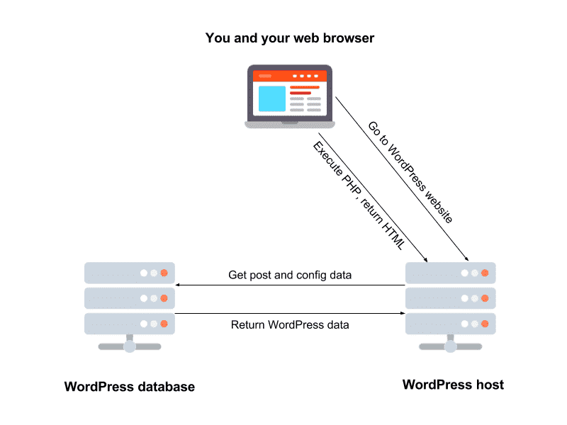 Când cineva vizitează o pagină de pe site-ul dvs., trebuie să solicite informații de la gazda dvs. web. Aceste cereri includ fișiere precum fișiere HTML și PHP, scripturi, imagini și fonturi. În plus, utilizatorul trebuie să recupereze conținut stocat în baza de date WordPress, de ex. postări și pagini.