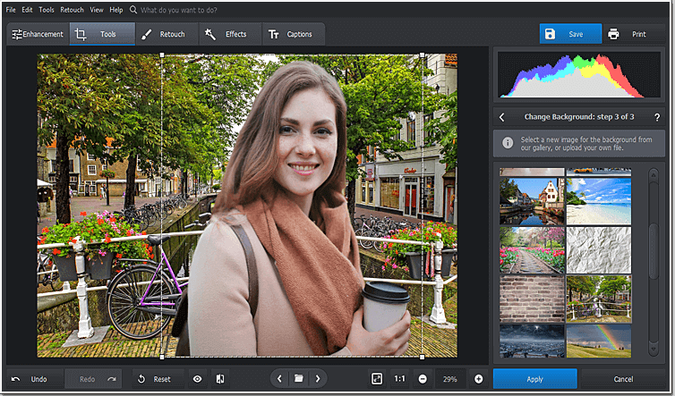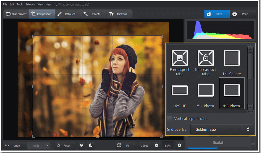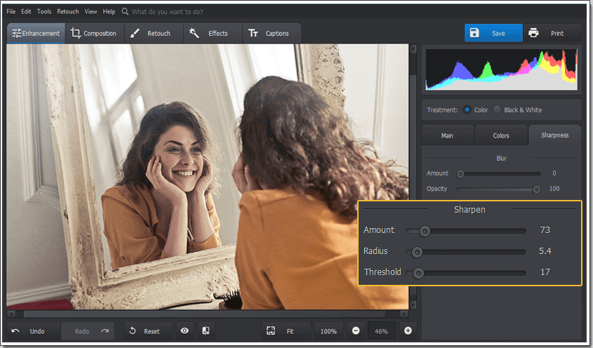 Iluminarea deficitară este una dintre cele mai frecvente greșeli făcute de fotografii începători. Din fericire, fotografiile prea întunecate sau prea strălucitoare pot fi salvate în post-producție. Acest Editor de fotografii portret este echipat cu un modul de îmbunătățire automată care poate fixa lumina puternică sau nuanțele profunde în fotografii. Istograma de pe bara laterală vă va arăta cum a afectat această editare fotografia aleasă – dacă datele au fost distribuite destul de bine pe grafic, iluminarea imaginii dvs. este bună. Dacă doriți să aveți control deplin asupra tuturor modificărilor, îmbunătățiți manual iluminarea din portrete. Reglați setările Exposure, Highlights și Shadows unul câte unul și verificați rezultatul.